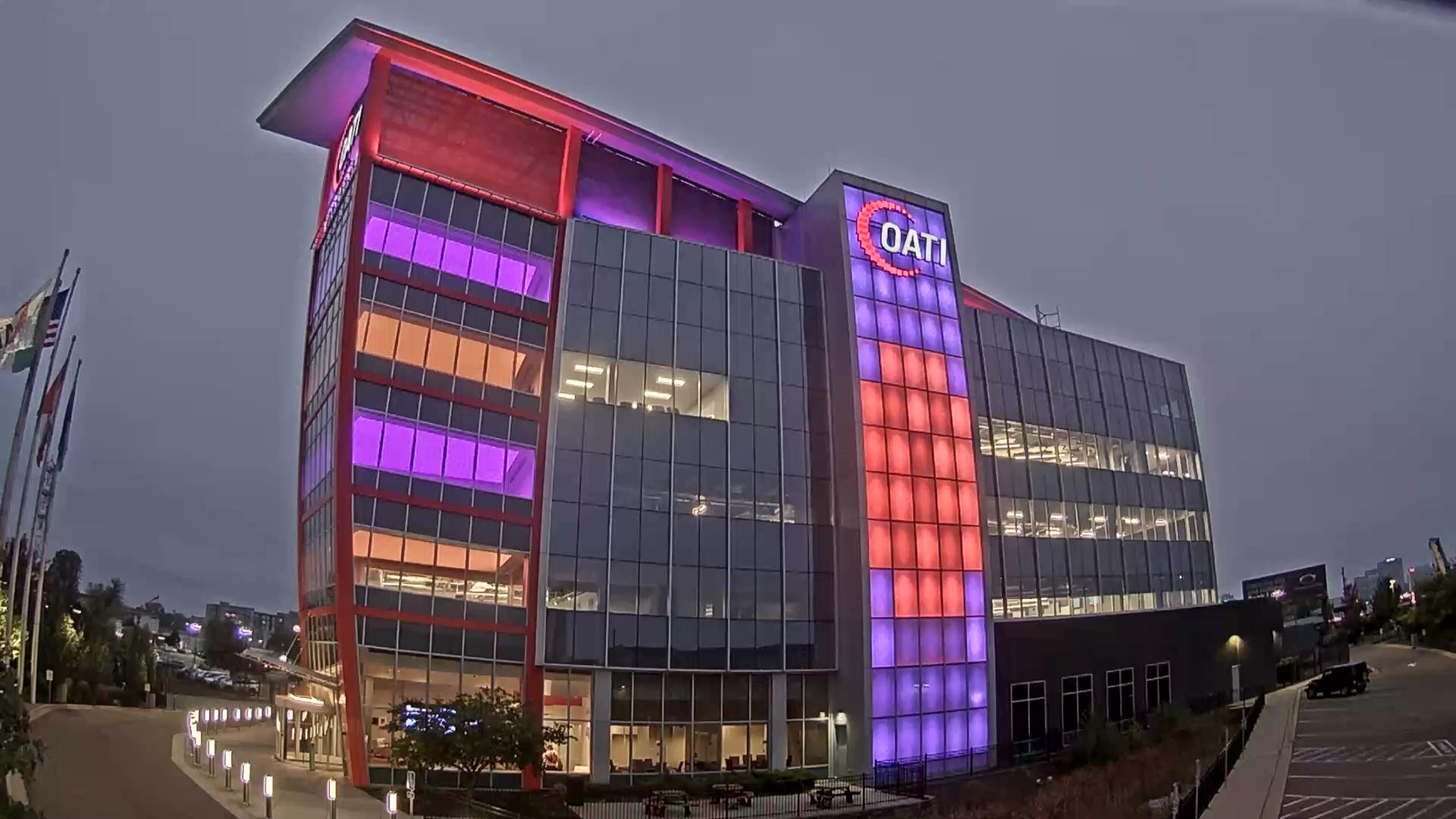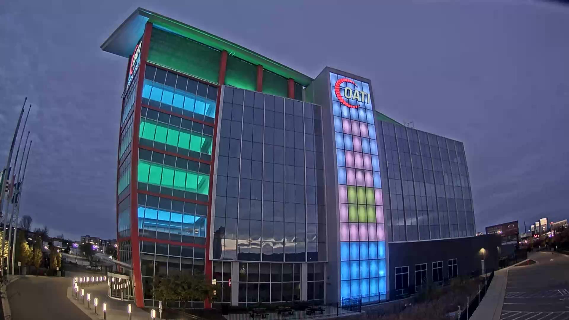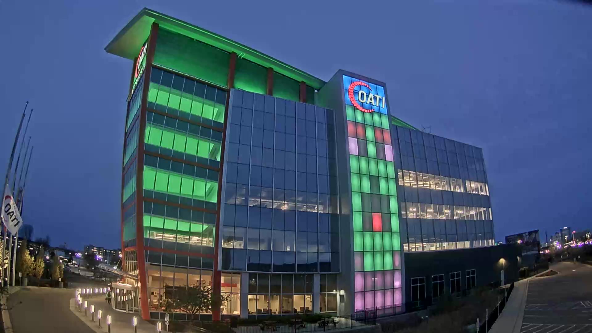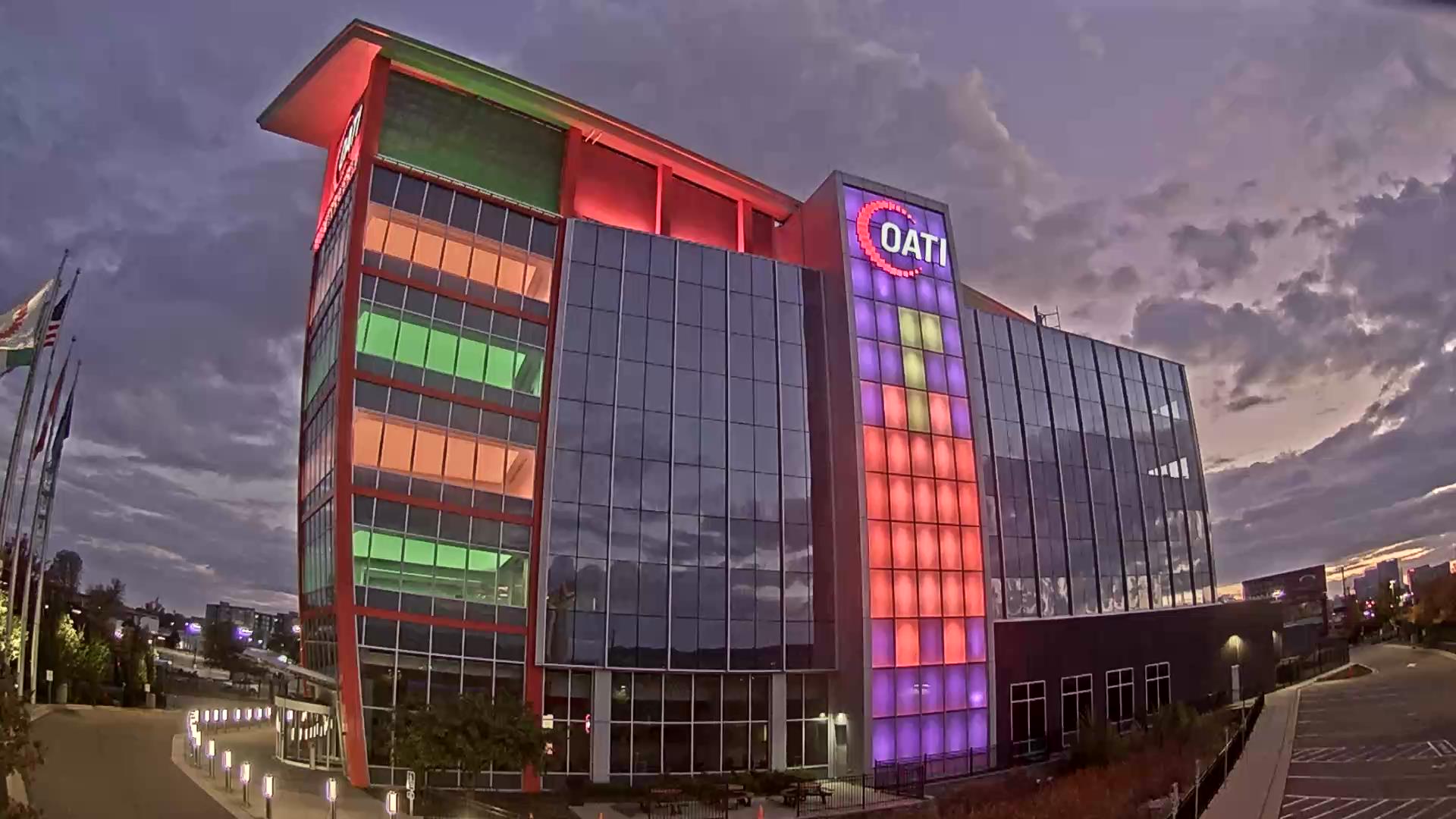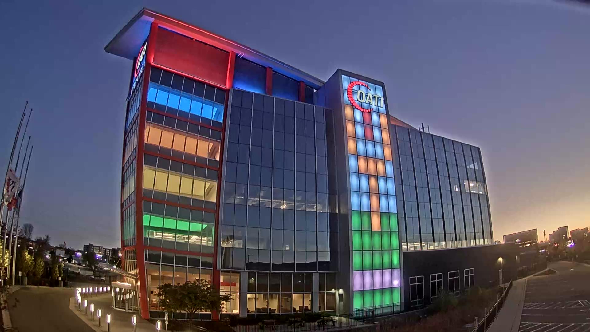 From the American flag to a glowing game of Tetris, the OATI Microgrid Technology Center illuminates a variety of unique light displays to about 172,000 commuters every day. Located in Bloomington, MN, this building is powered by several renewable energy resources, and consists of four office floors, a wraparound roof, and an over 100-foot-tall LED wall.
