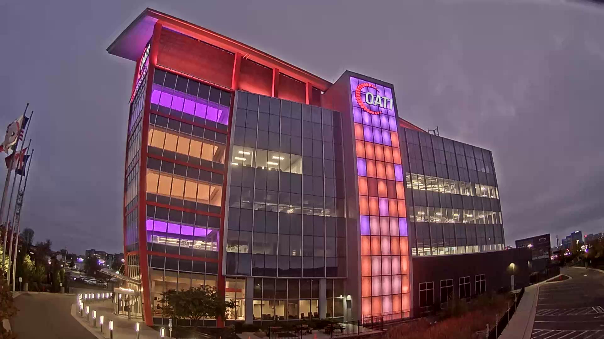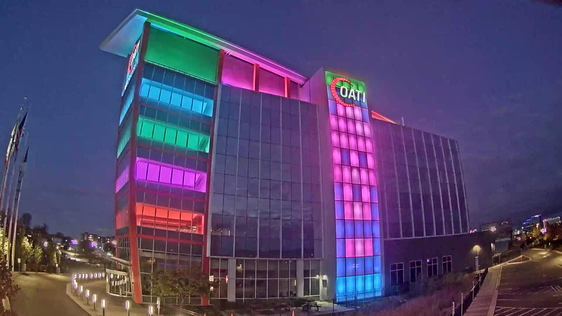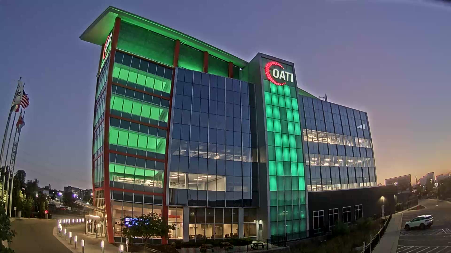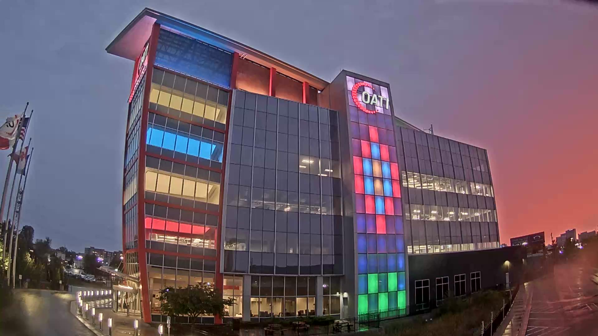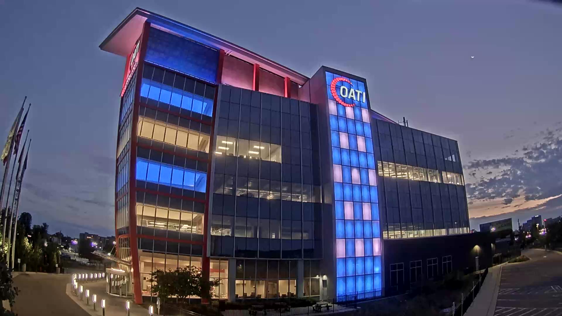 From the American flag to a glowing game of Tetris, the OATI Microgrid Technology Center illuminates a variety of unique light displays to about 172,000 commuters every day. Located in Bloomington, MN, this building is powered by several renewable energy resources, and consists of four office floors, a wraparound roof, and an over 100-foot-tall LED wall.