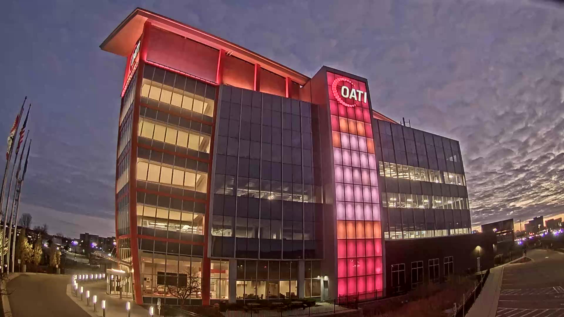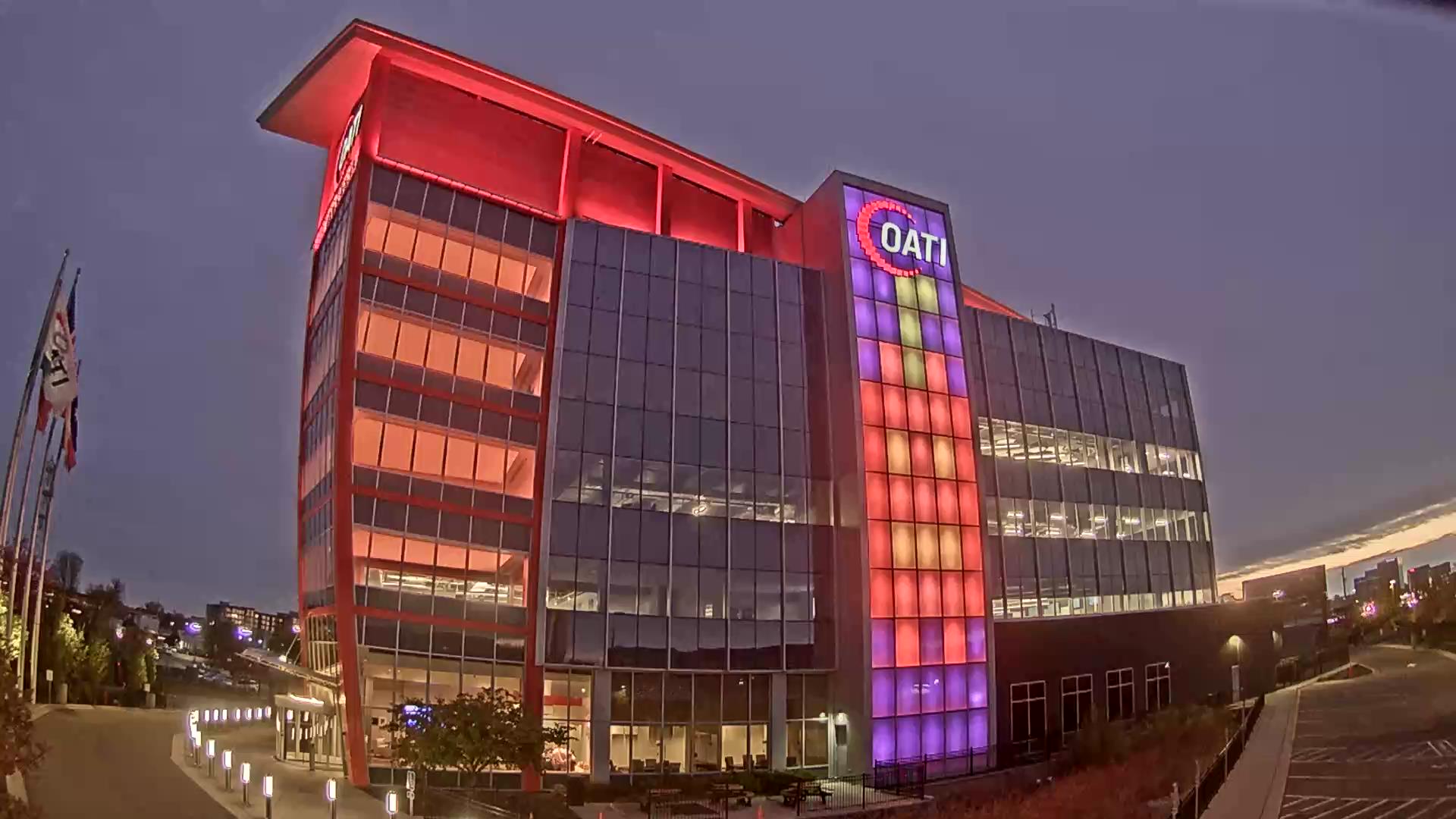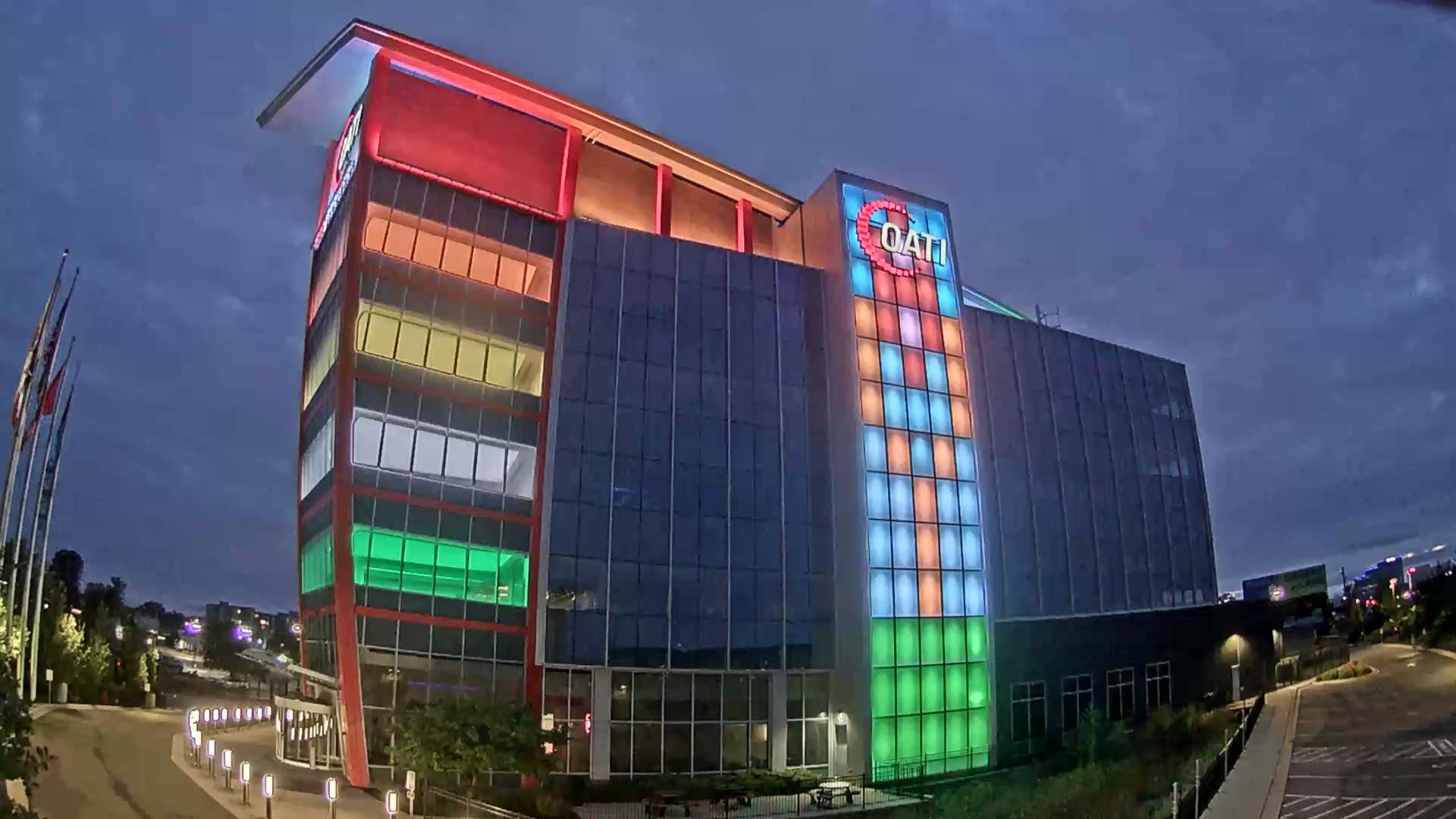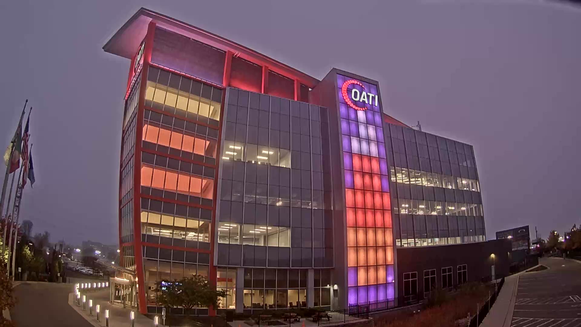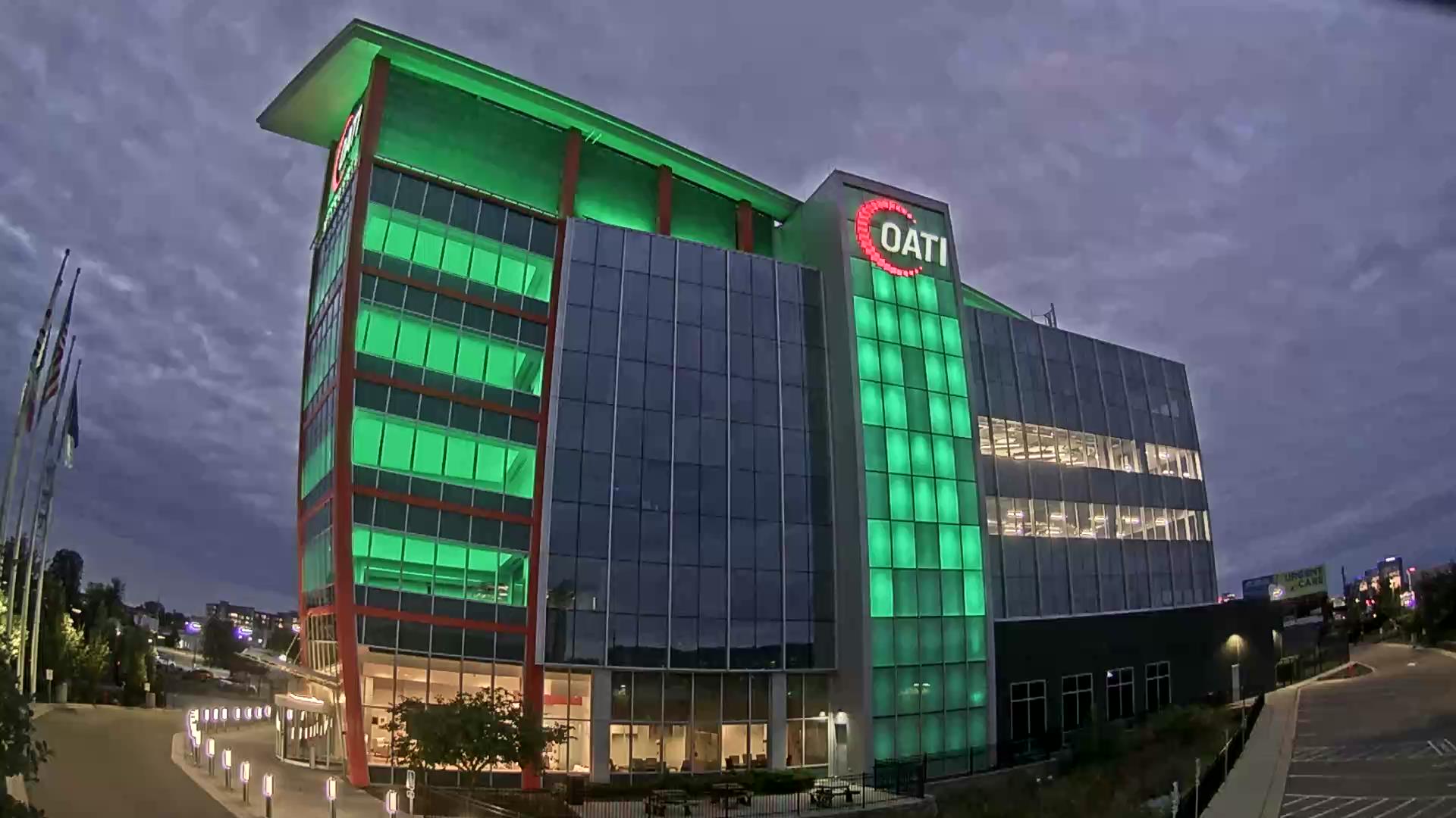 From the American flag to a glowing game of Tetris, the OATI Microgrid Technology Center illuminates a variety of unique light displays to about 172,000 commuters every day. Located in Bloomington, MN, this building is powered by several renewable energy resources, and consists of four office floors, a wraparound roof, and an over 100-foot-tall LED wall.