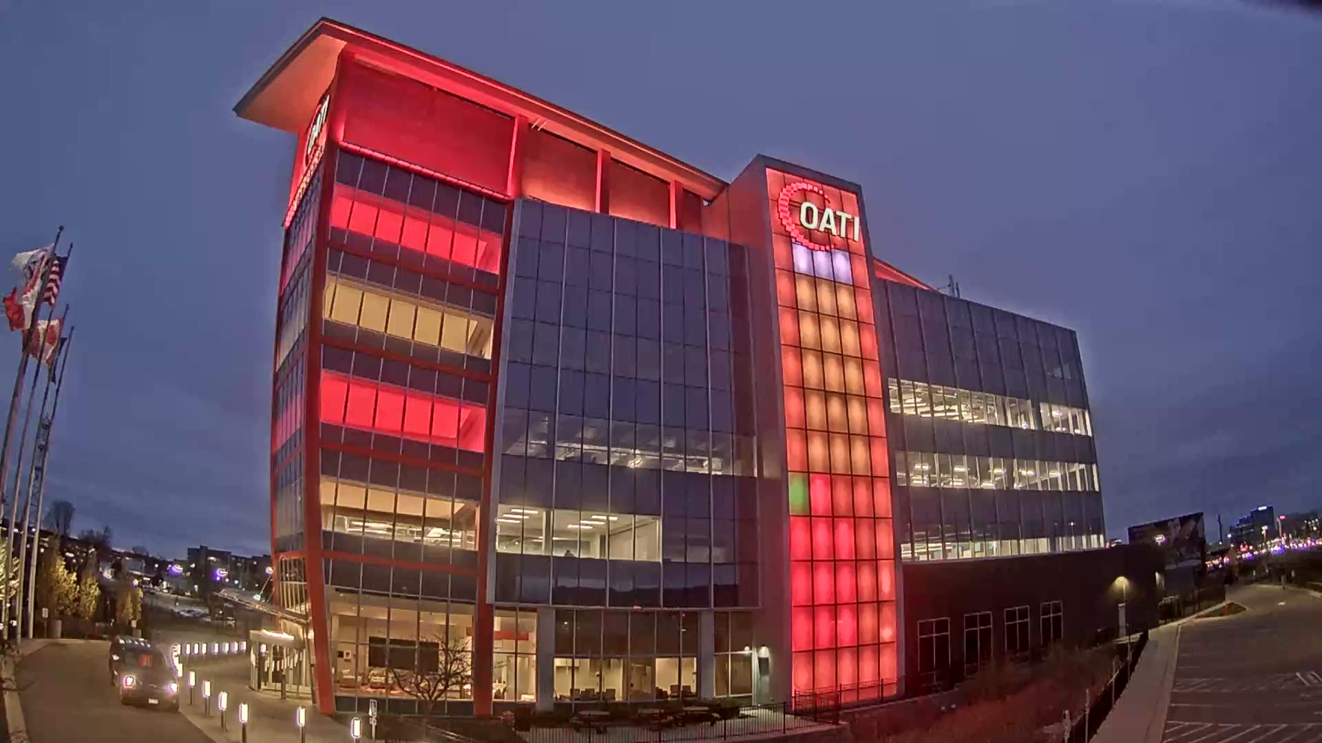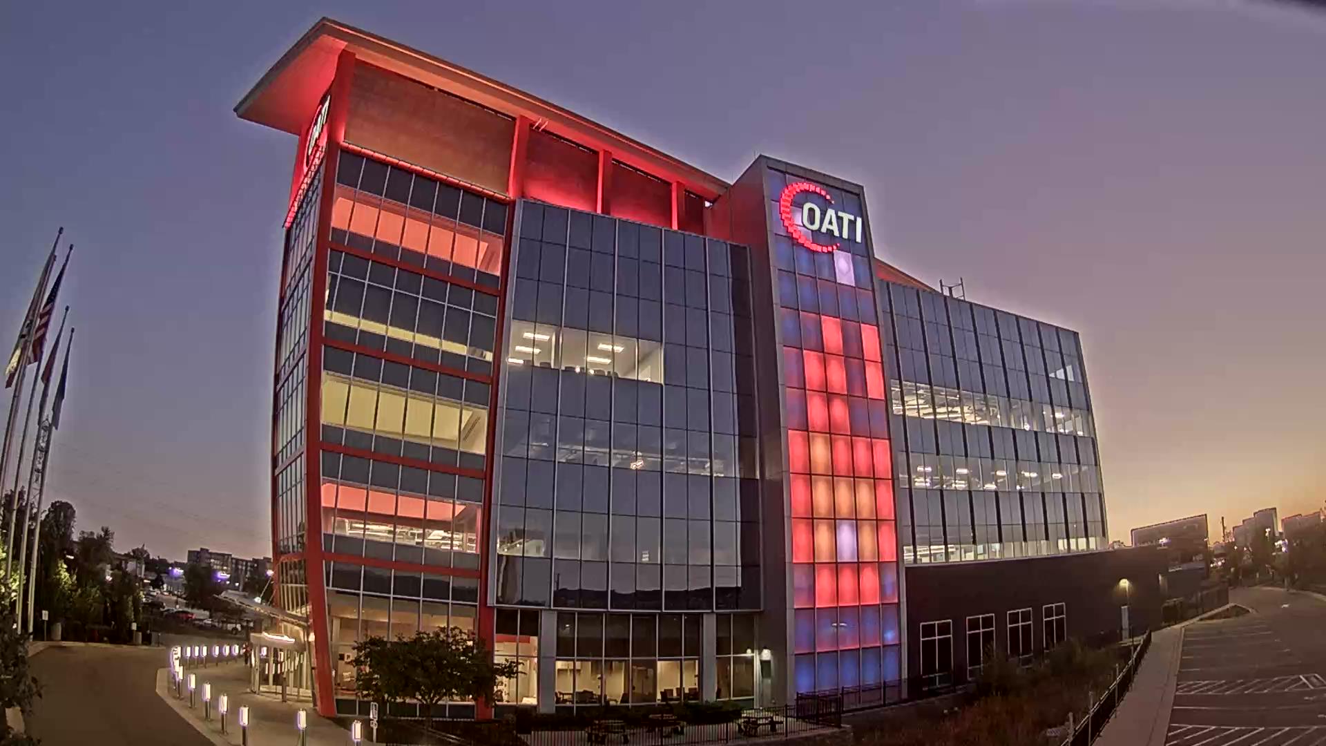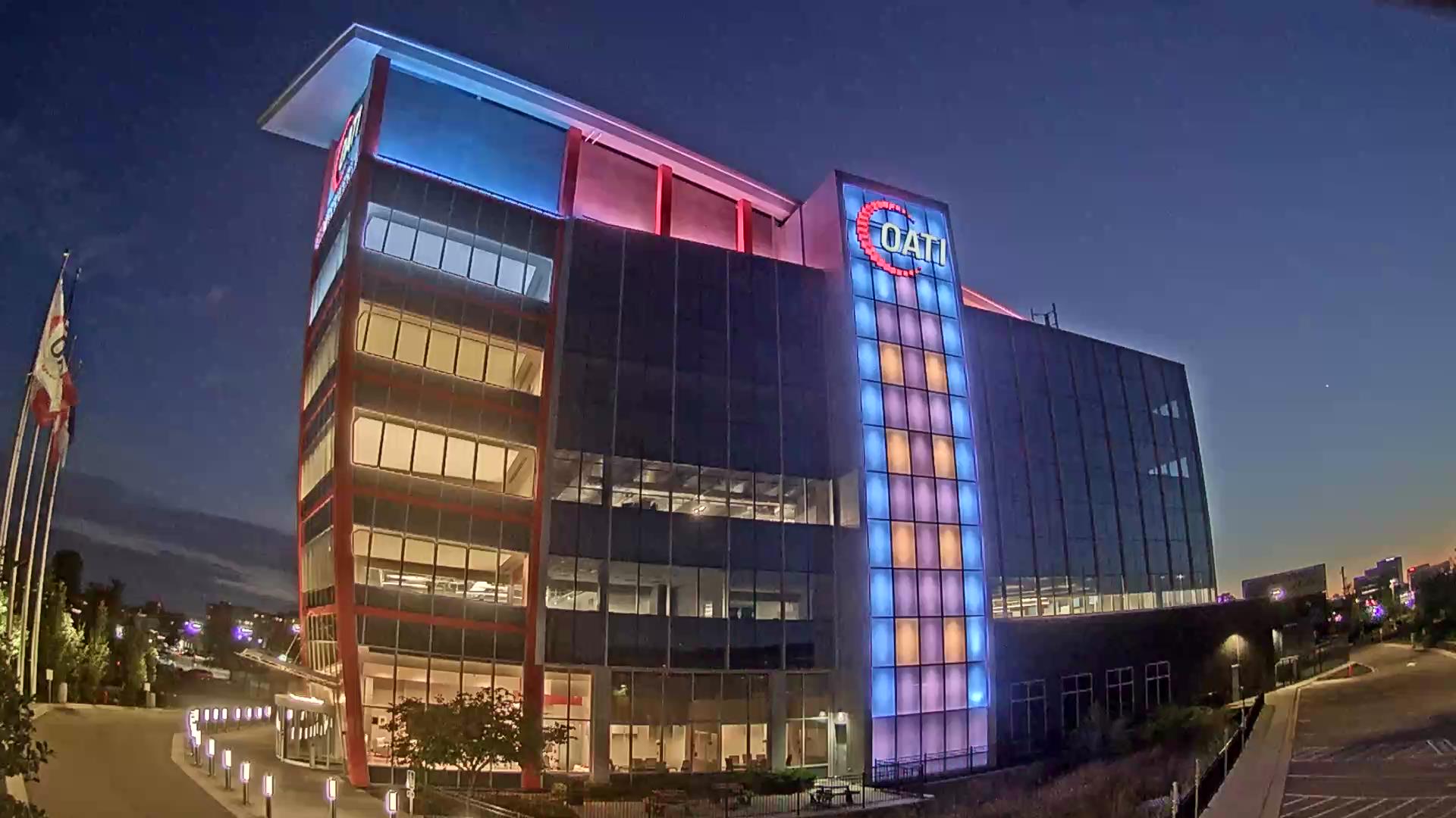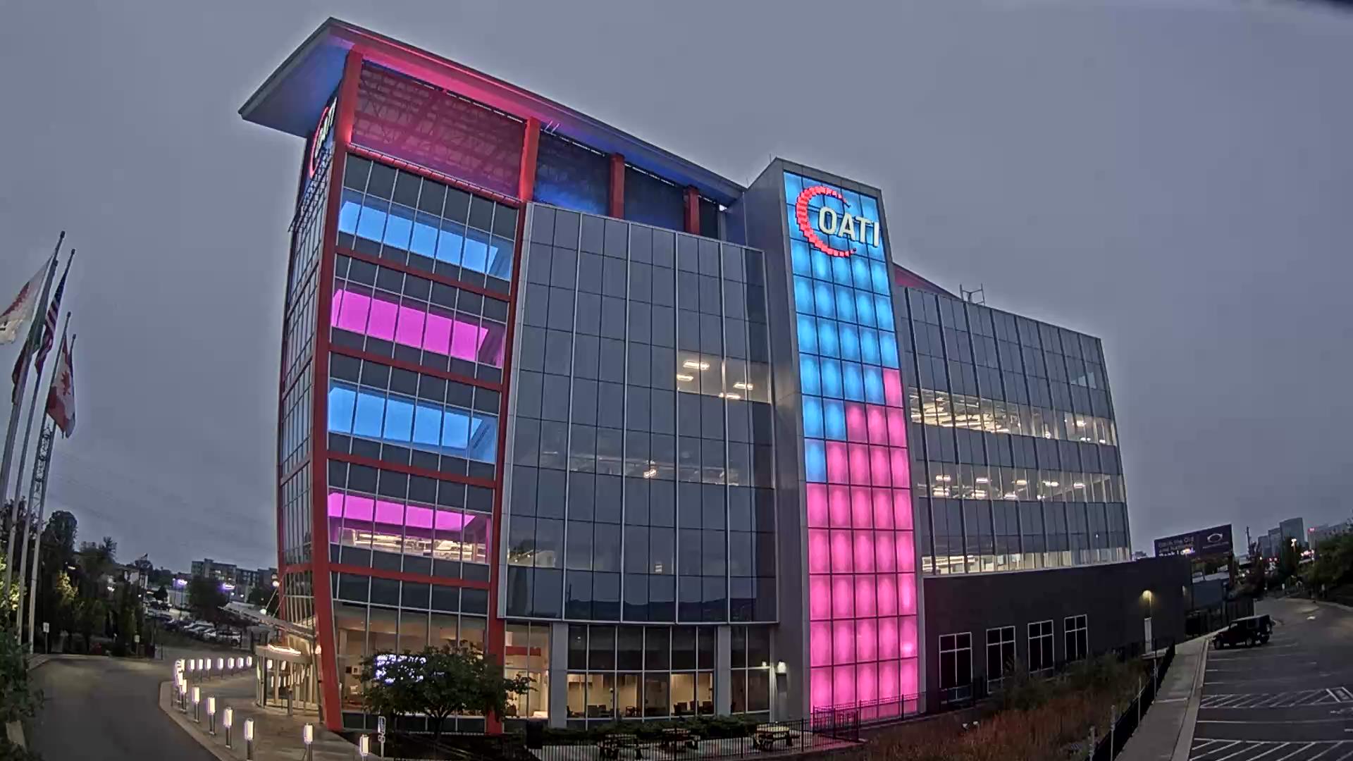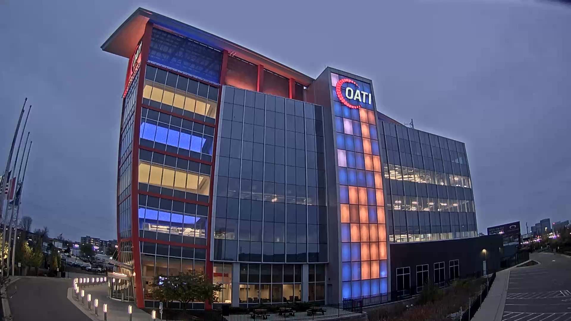 From the American flag to a glowing game of Tetris, the OATI Microgrid Technology Center illuminates a variety of unique light displays to about 172,000 commuters every day. Located in Bloomington, MN, this building is powered by several renewable energy resources, and consists of four office floors, a wraparound roof, and an over 100-foot-tall LED wall.