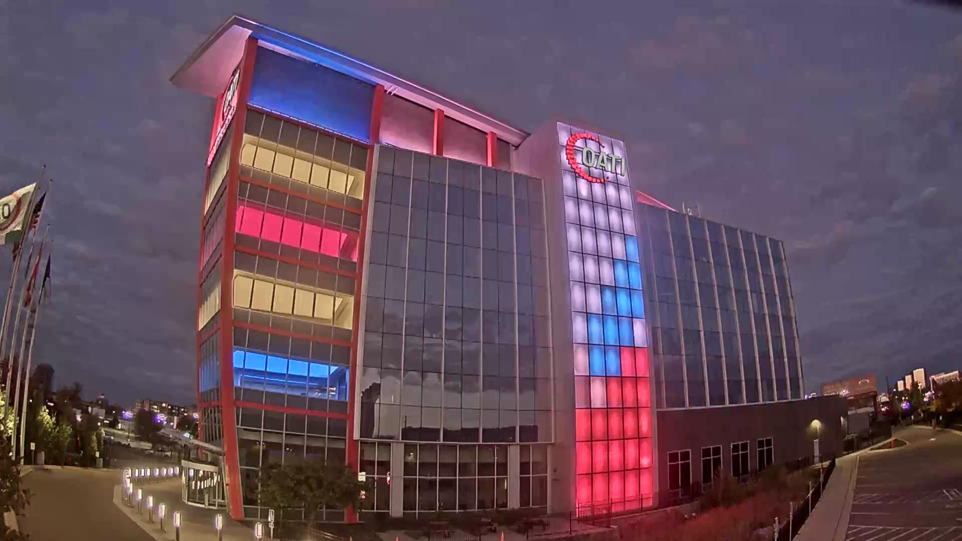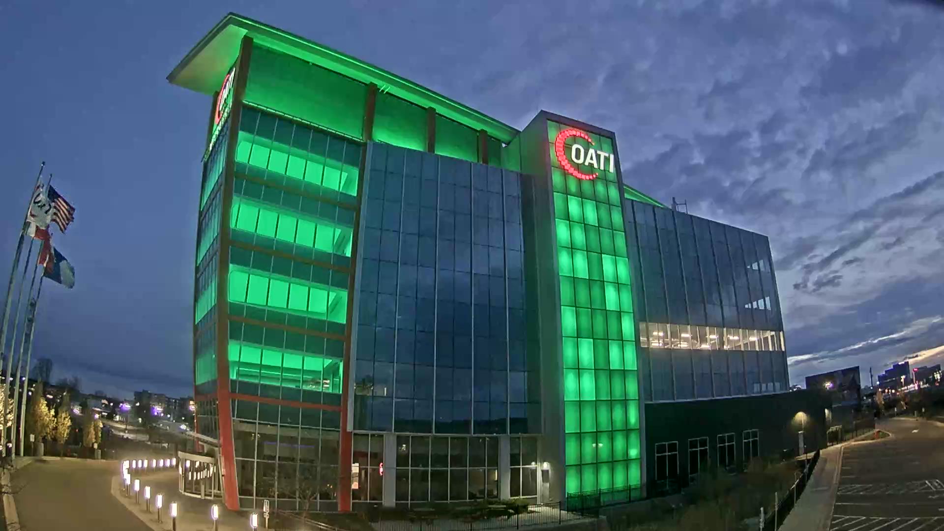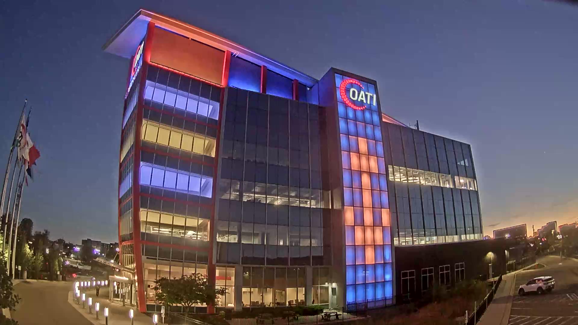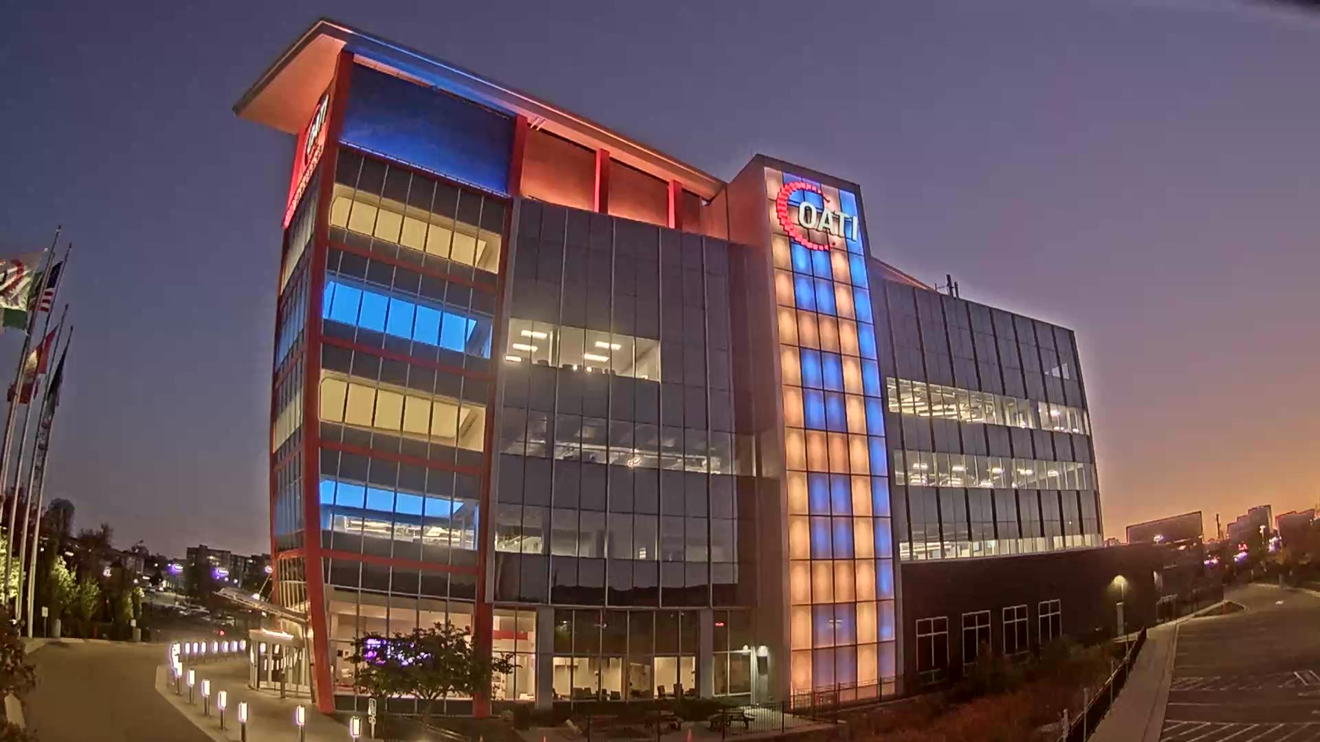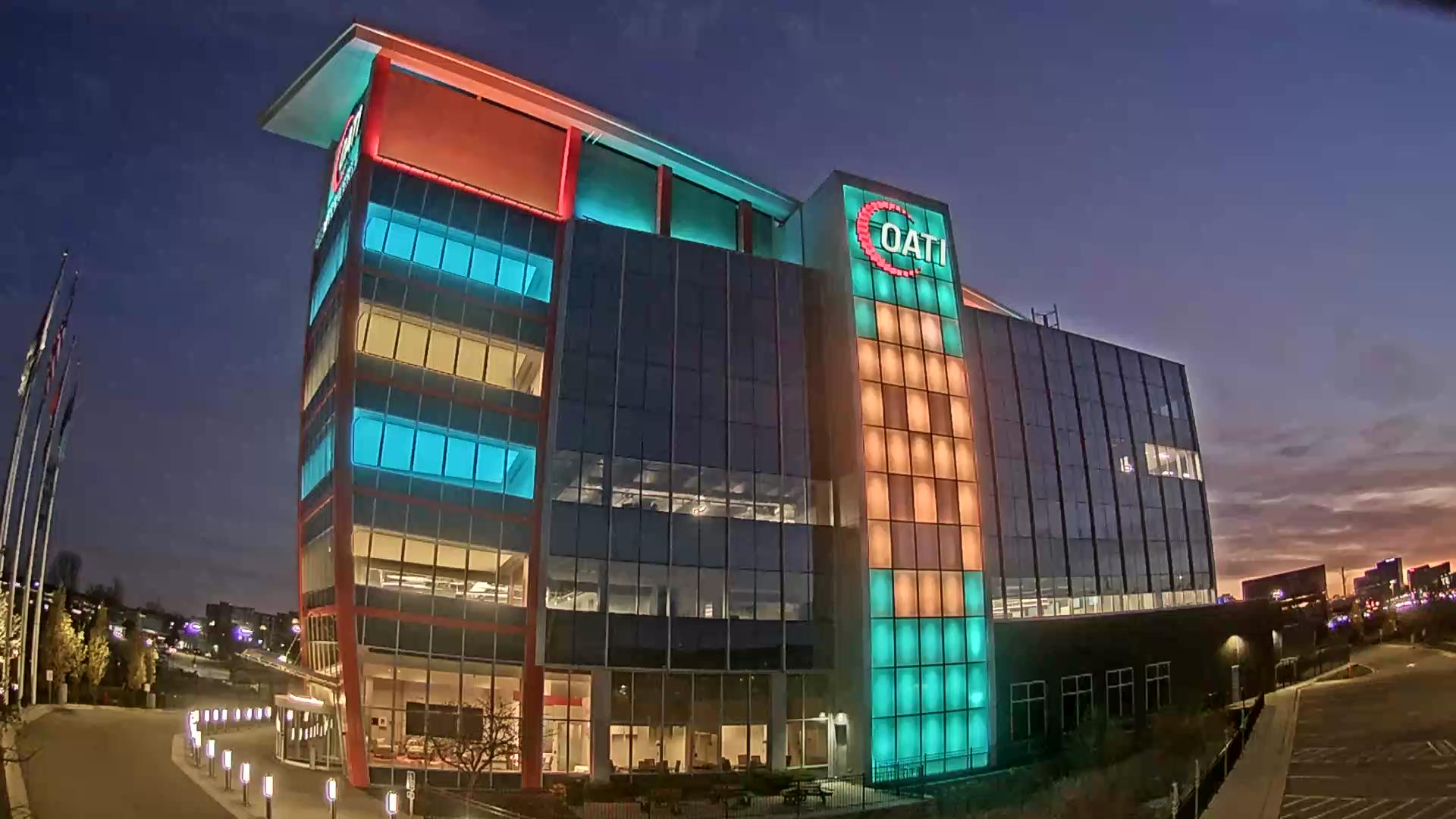 From the American flag to a glowing game of Tetris, the OATI Microgrid Technology Center illuminates a variety of unique light displays to about 172,000 commuters every day. Located in Bloomington, MN, this building is powered by several renewable energy resources, and consists of four office floors, a wraparound roof, and an over 100-foot-tall LED wall.