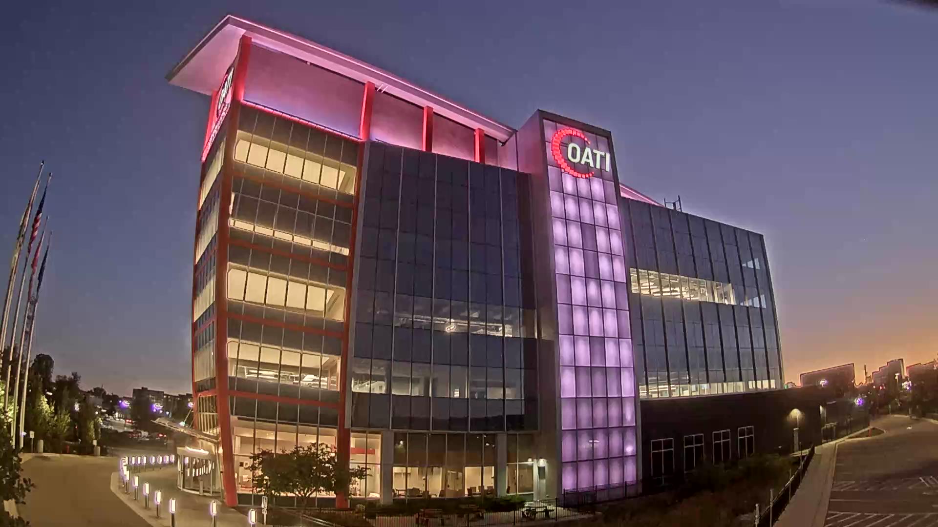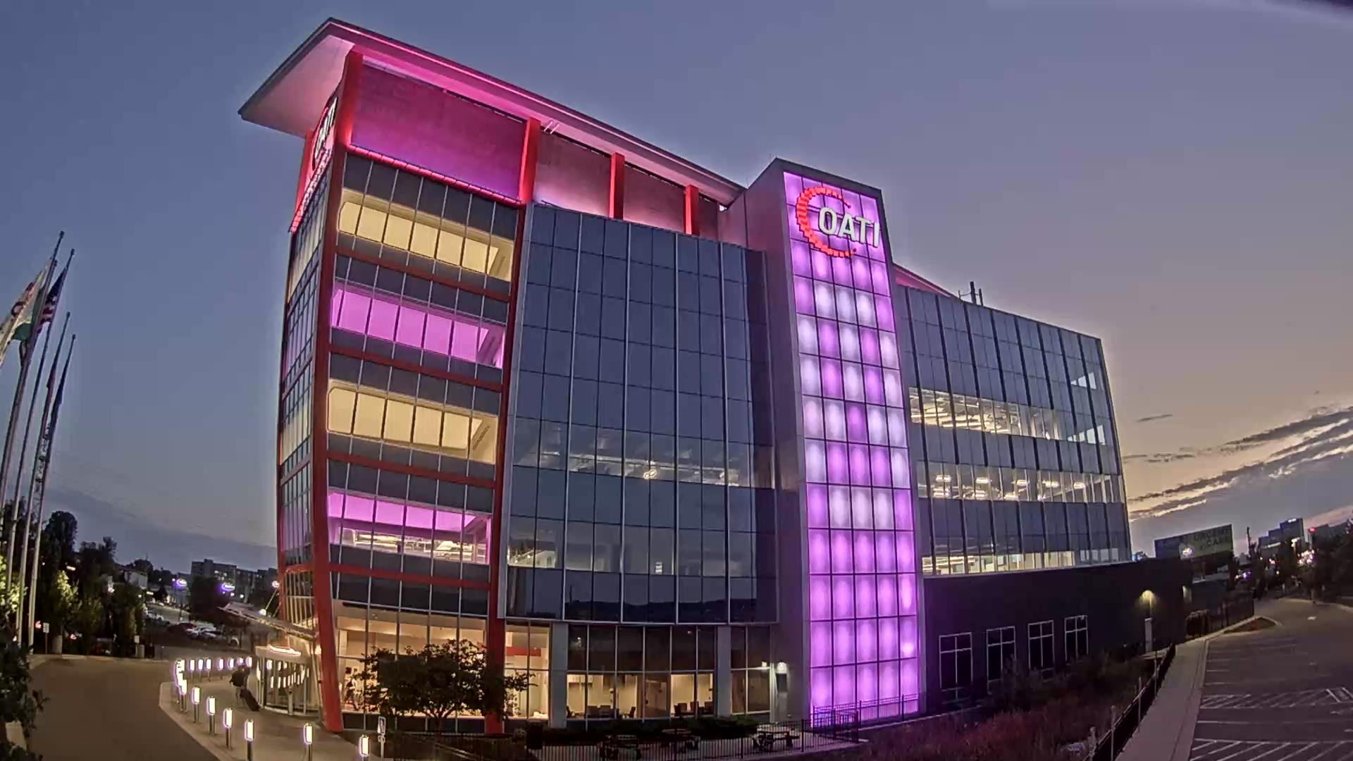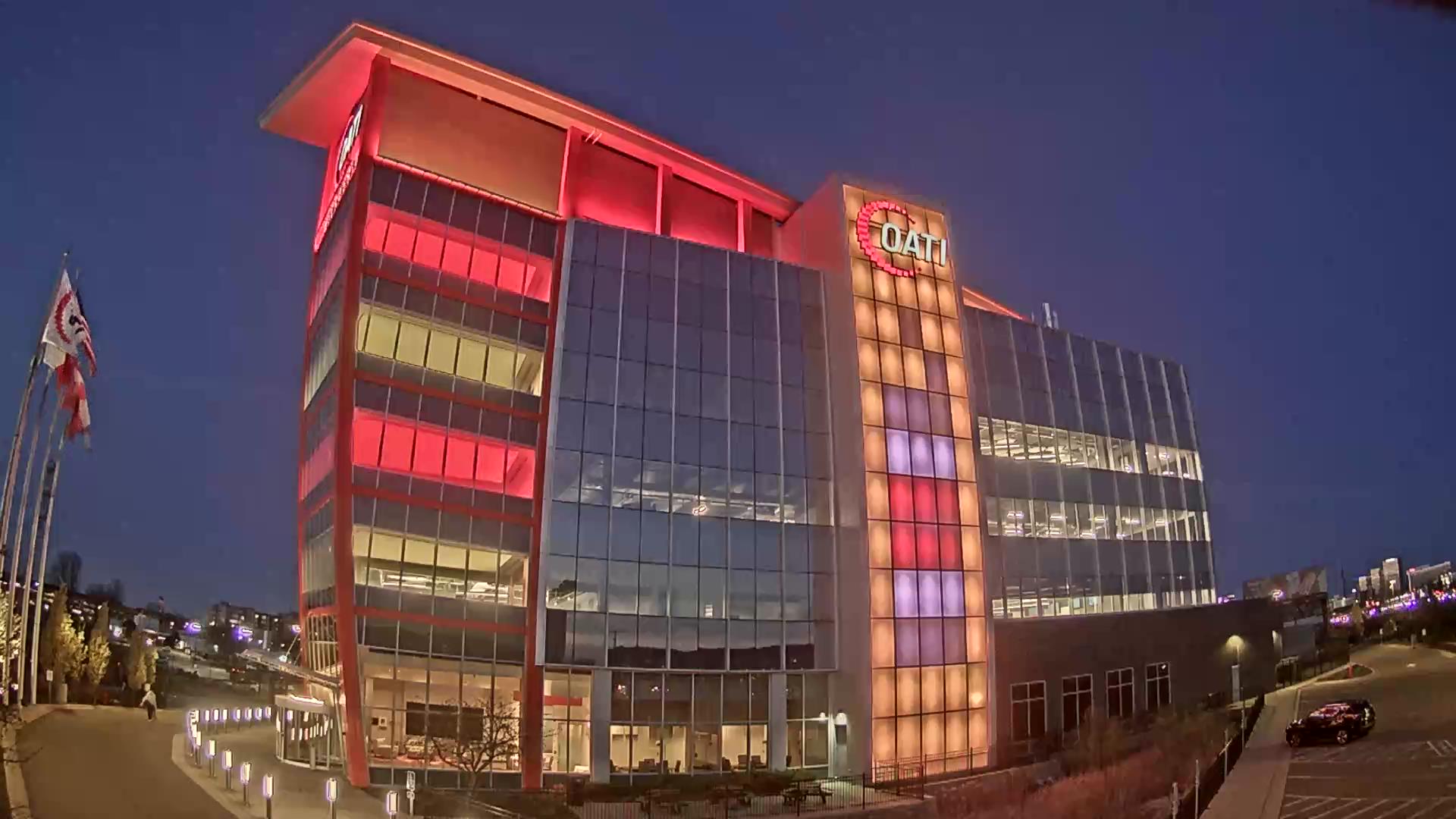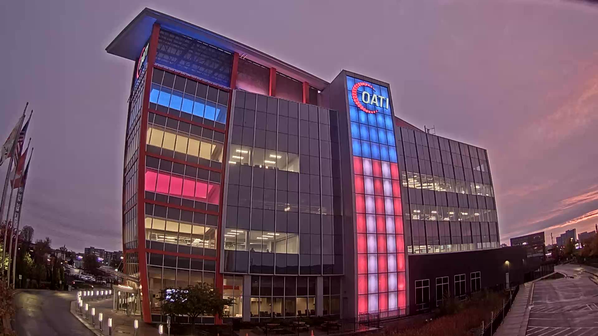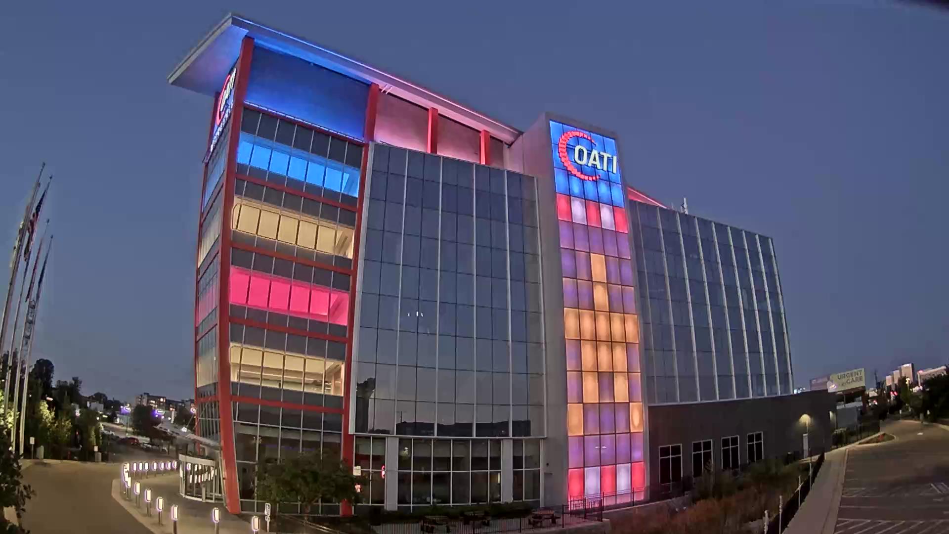 From the American flag to a glowing game of Tetris, the OATI Microgrid Technology Center illuminates a variety of unique light displays to about 172,000 commuters every day. Located in Bloomington, MN, this building is powered by several renewable energy resources, and consists of four office floors, a wraparound roof, and an over 100-foot-tall LED wall.