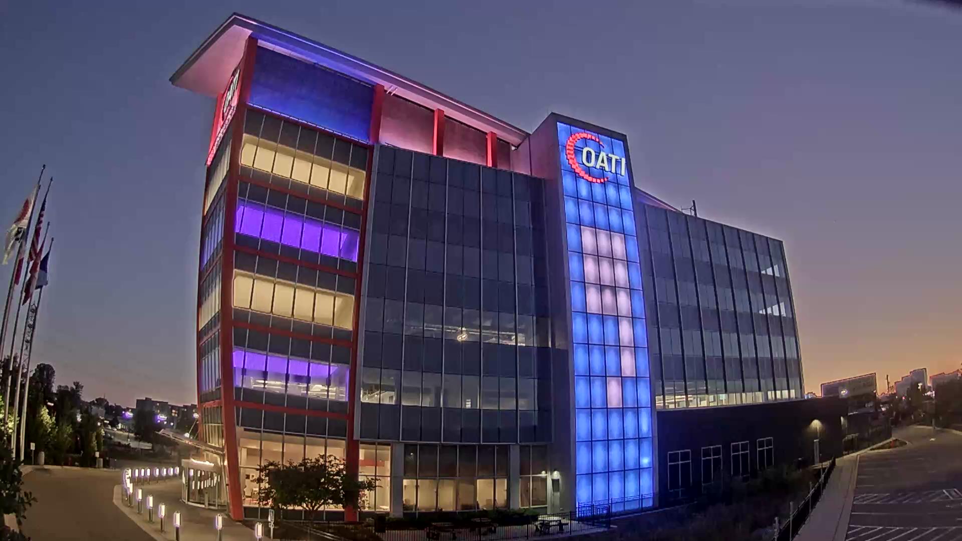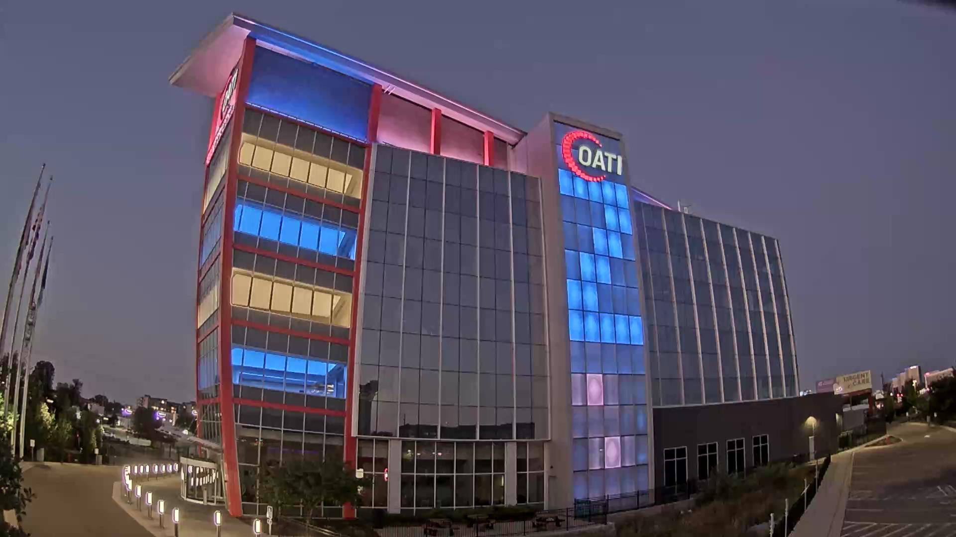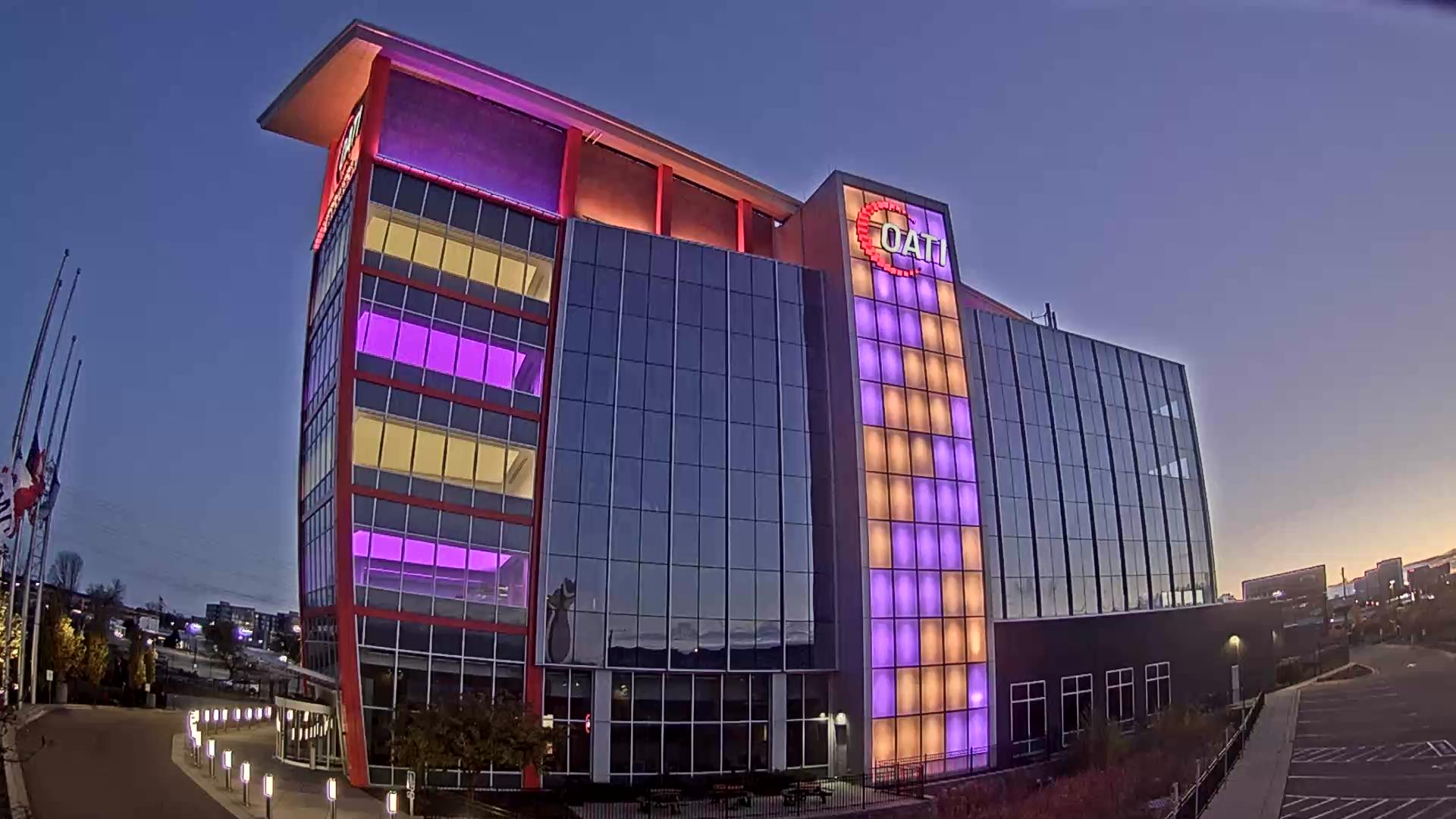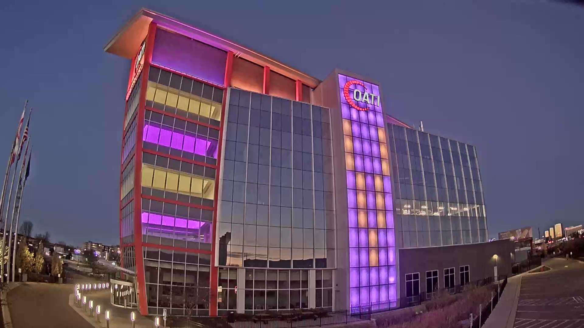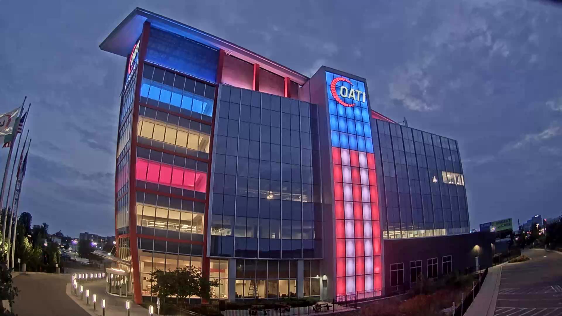 From the American flag to a glowing game of Tetris, the OATI Microgrid Technology Center illuminates a variety of unique light displays to about 172,000 commuters every day. Located in Bloomington, MN, this building is powered by several renewable energy resources, and consists of four office floors, a wraparound roof, and an over 100-foot-tall LED wall.