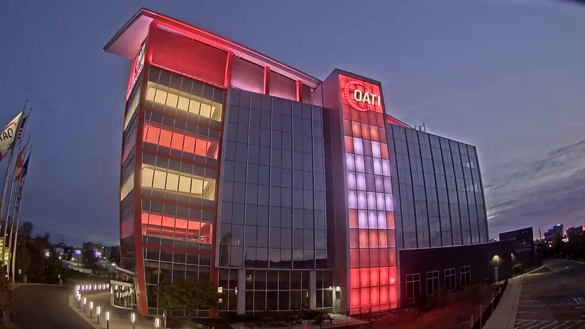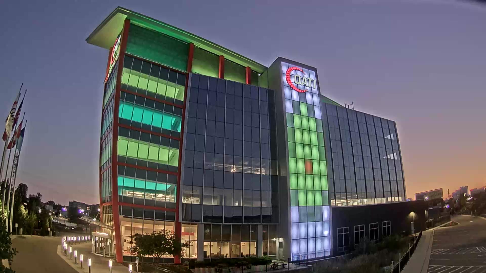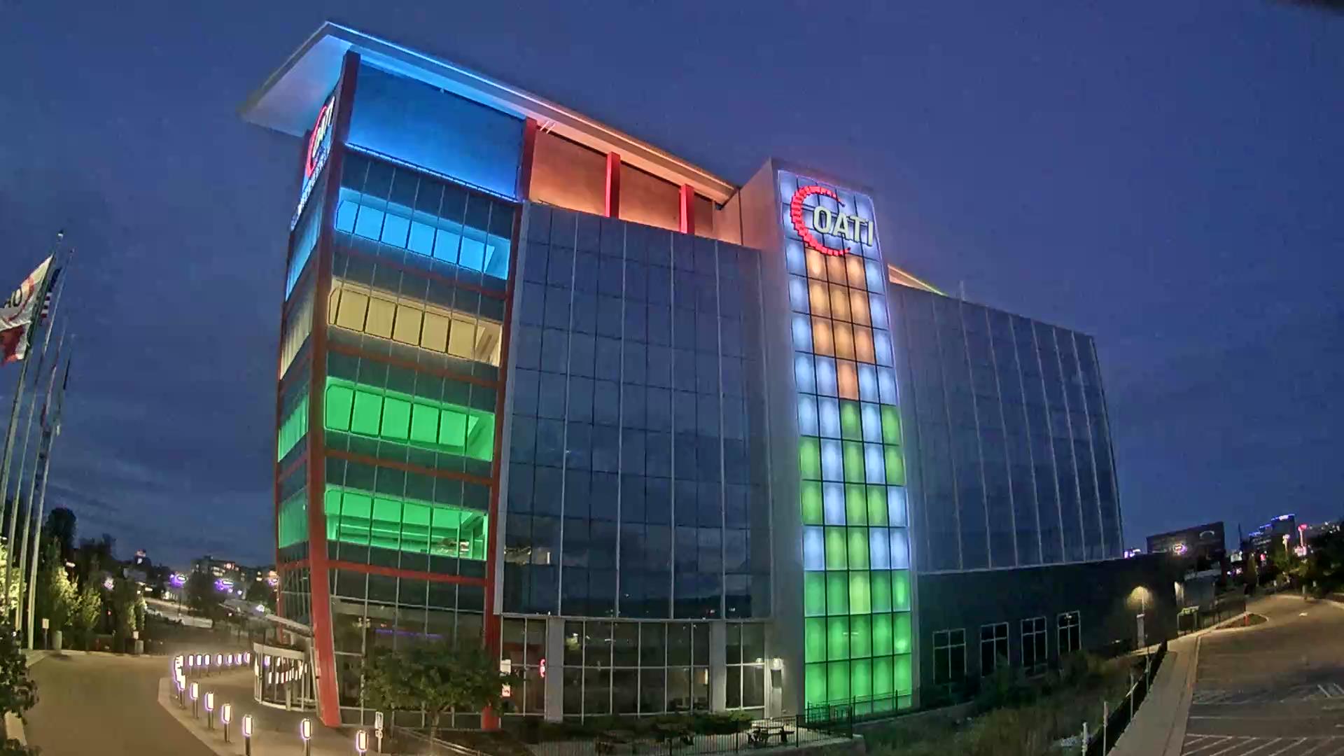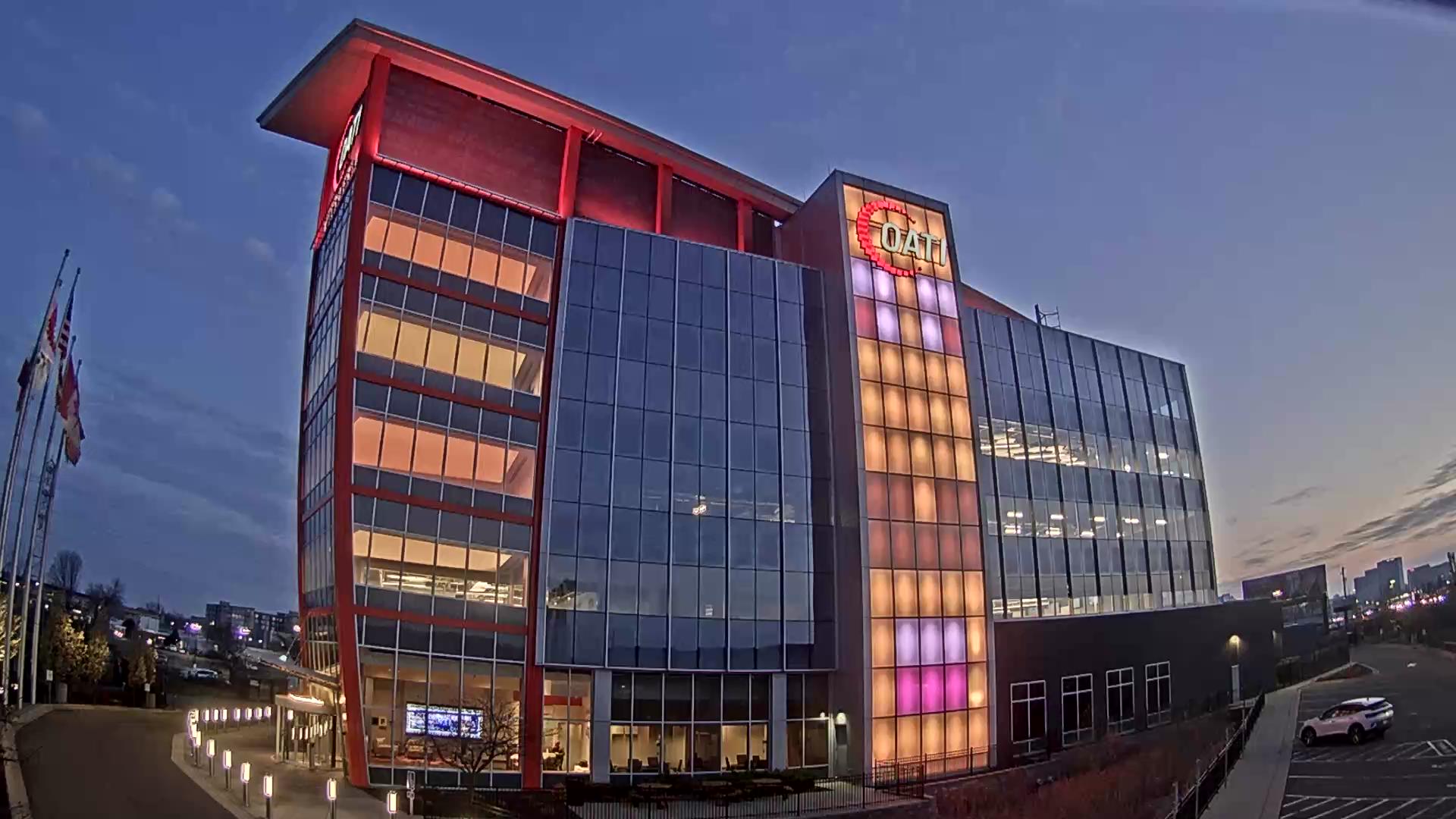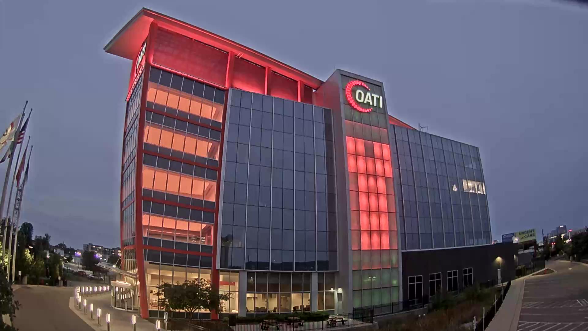 From the American flag to a glowing game of Tetris, the OATI Microgrid Technology Center illuminates a variety of unique light displays to about 172,000 commuters every day. Located in Bloomington, MN, this building is powered by several renewable energy resources, and consists of four office floors, a wraparound roof, and an over 100-foot-tall LED wall.